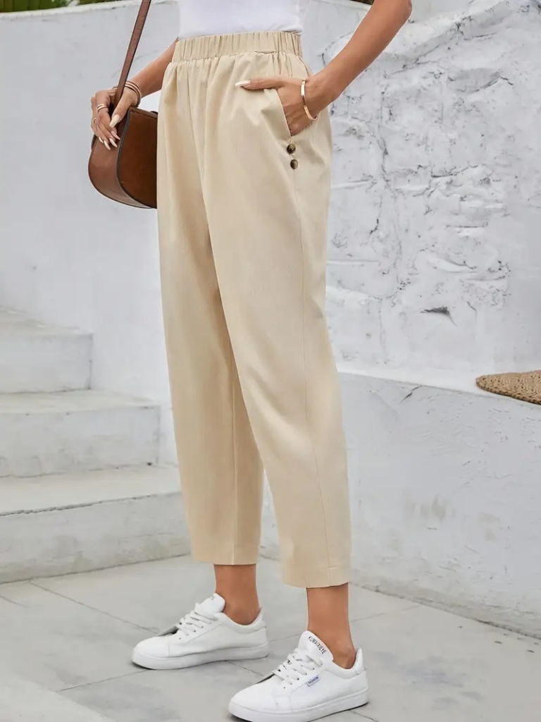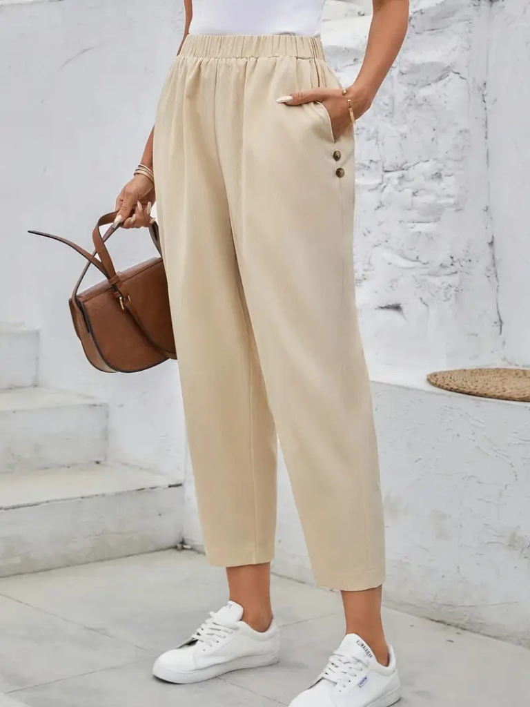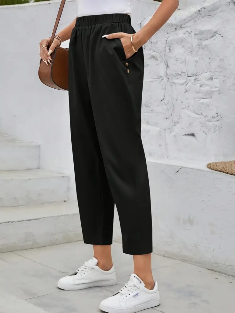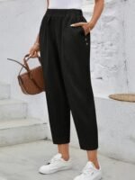 Kadın Düğme Detay Bol Paça Ithal Krep Pantolon