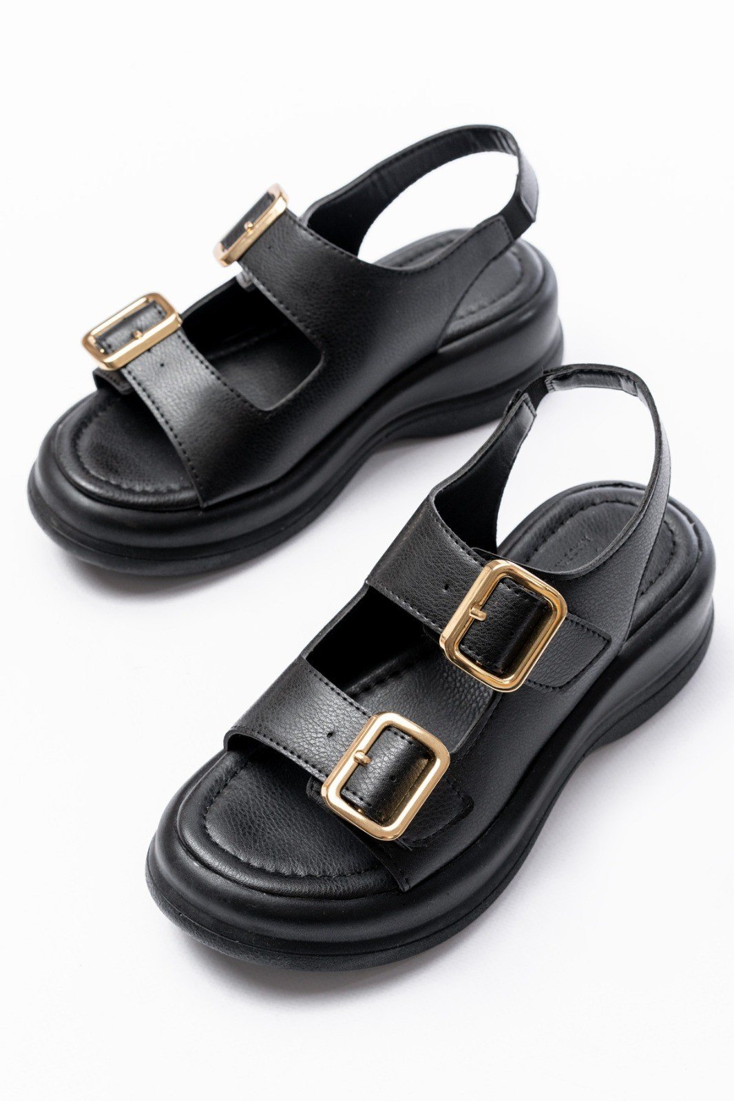 Kaji Siyah Cilt Çift Tokalı Sandalet