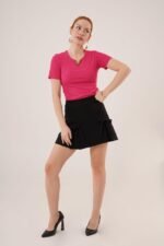 Kısa Kollu Yaka Detaylı Kaşkorse Fuşya Bluz