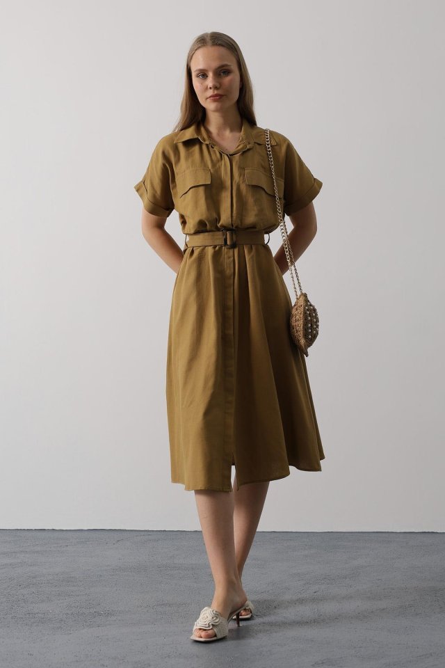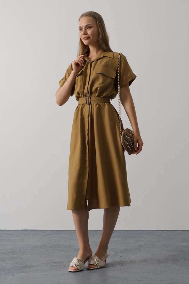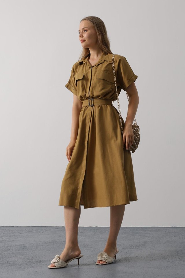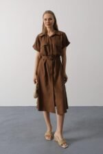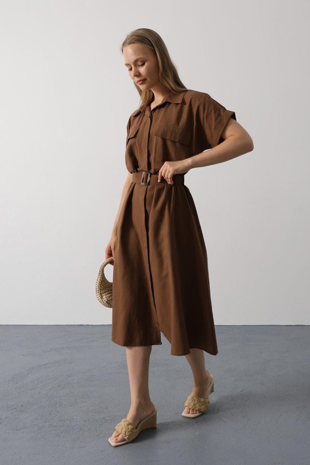 Kuşaklı Cep Detaylı Yarım Kol Elbise – Kahve