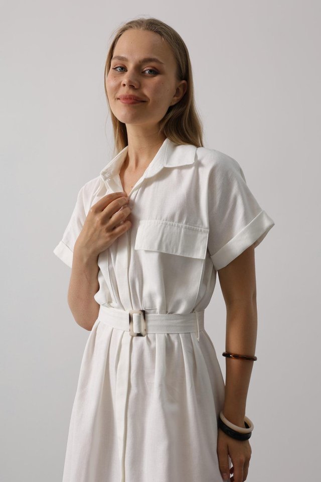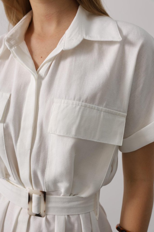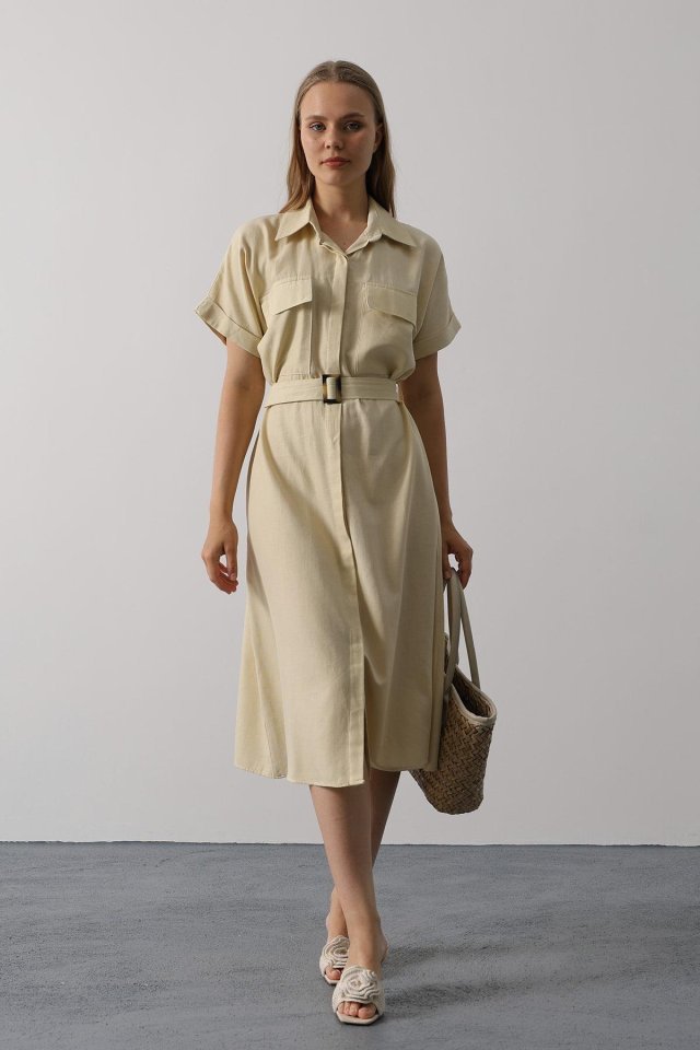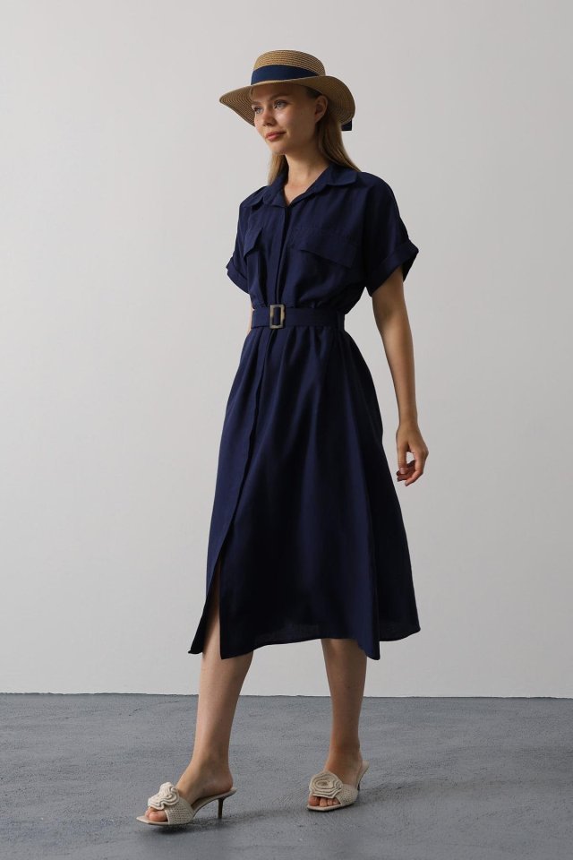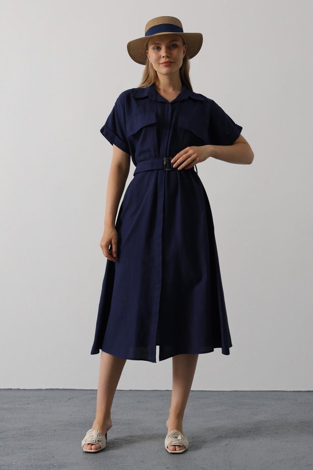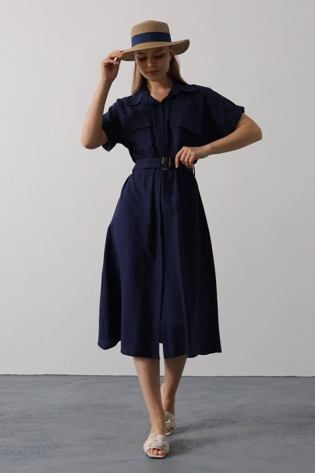 Kuşaklı Cep Detaylı Yarım Kol Elbise