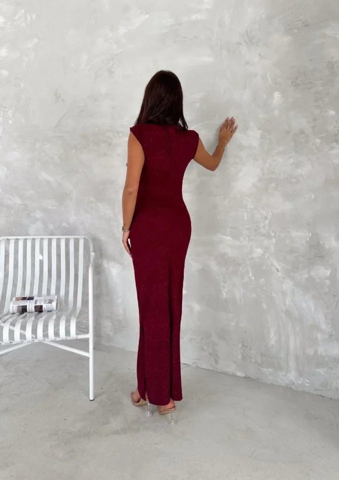 Likralı Simli Kumaş Yandan Yırtmaçlı Uzun Elbise Şık Kolsuz Abiye – Bordo