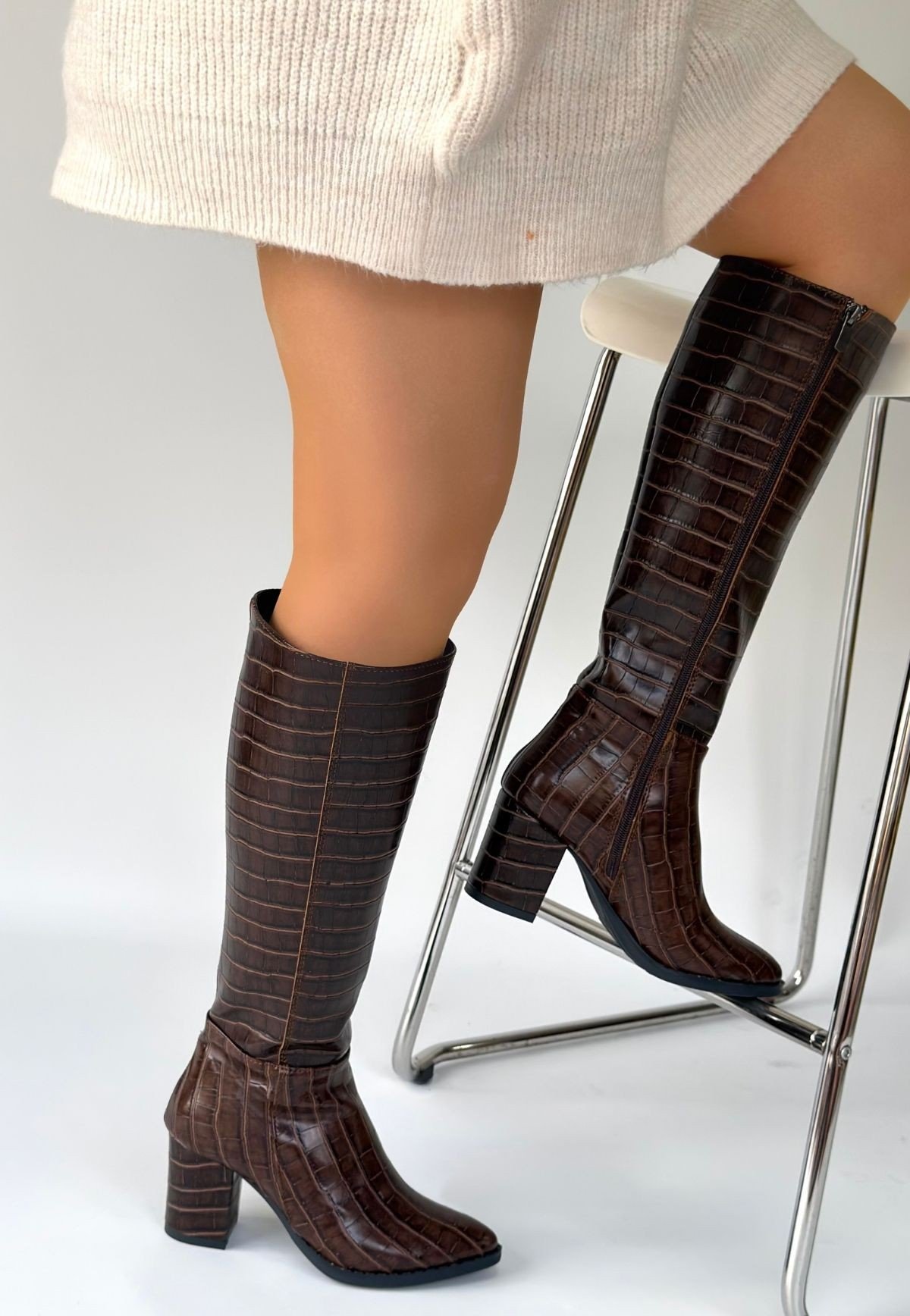 Morena Acı Kahve Desenli Rugan Topuklu Çizme
