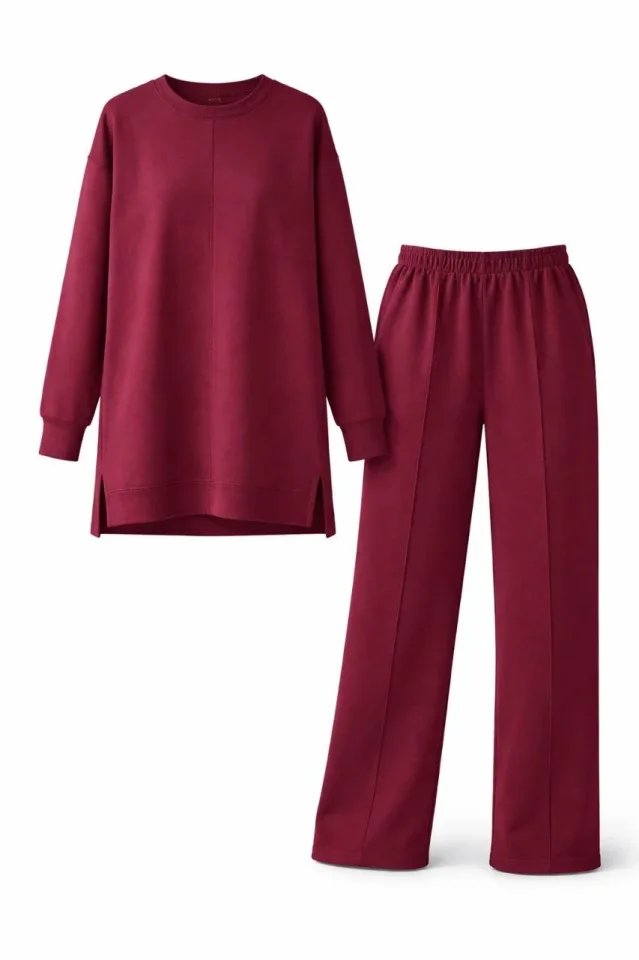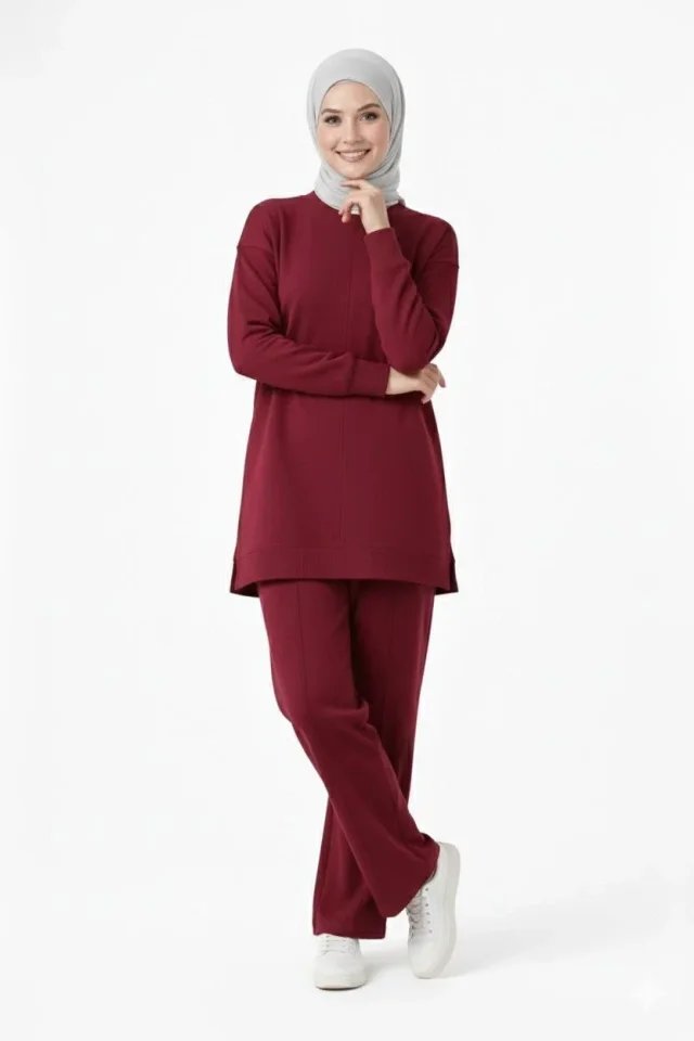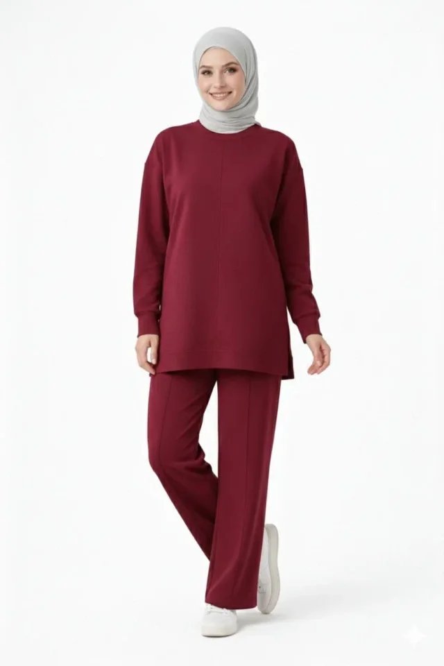 Osy Modal Yumuşak Dokulu Tesettür İkili Takım Yan Yırtmaçlı Uzun Tunik Ve Düz Paça Pantolon, Salaş Kalıp – Bordo