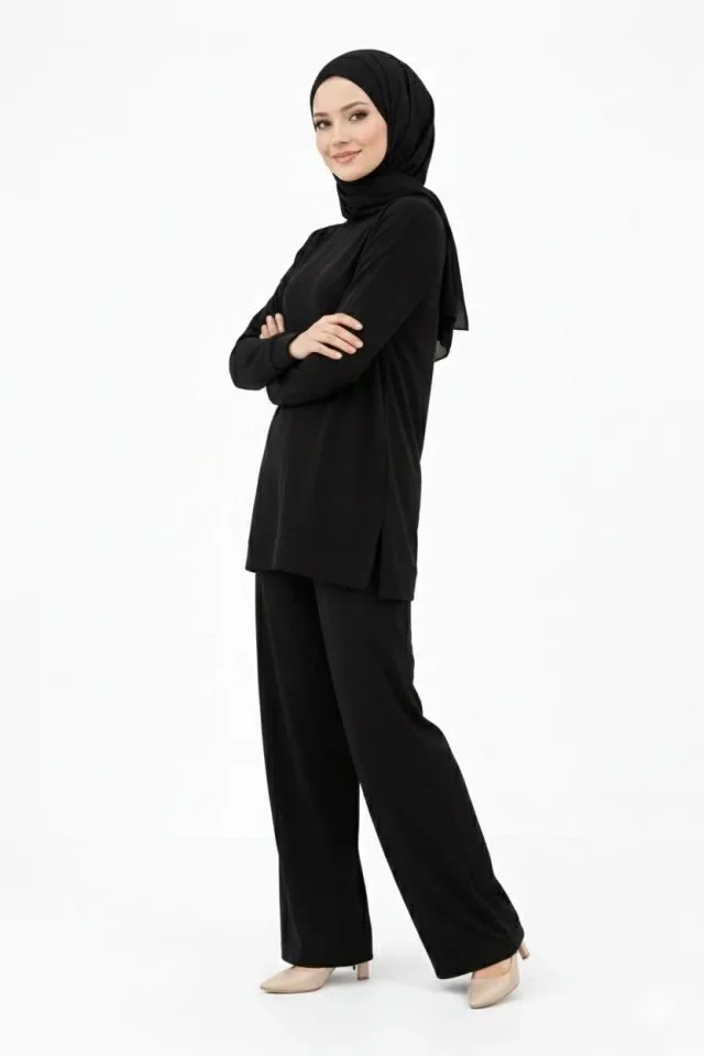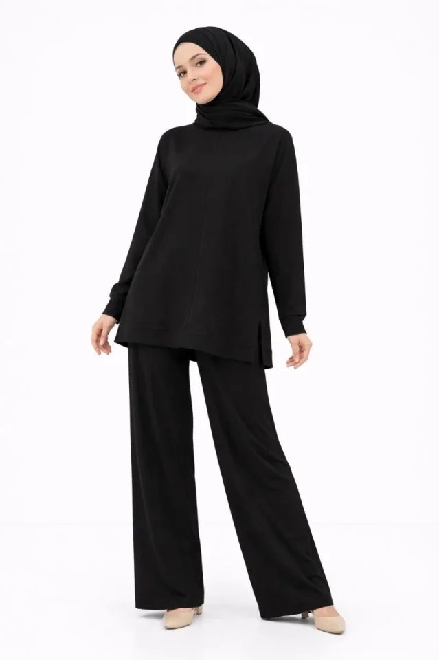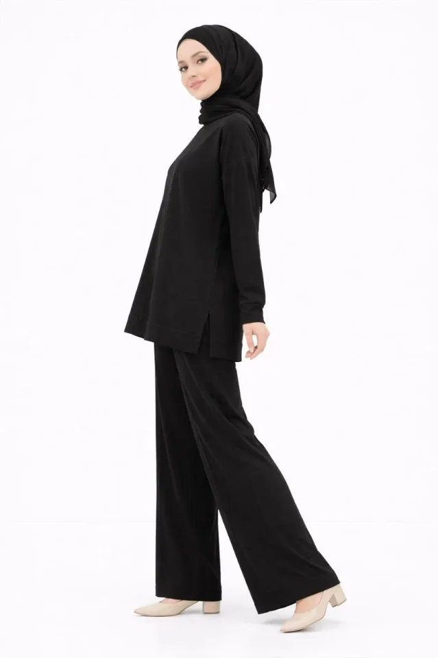 Osy Modal Yumuşak Dokulu Tesettür İkili Takım Yan Yırtmaçlı Uzun Tunik Ve Düz Paça Pantolon, Salaş Kalıp – Siyah