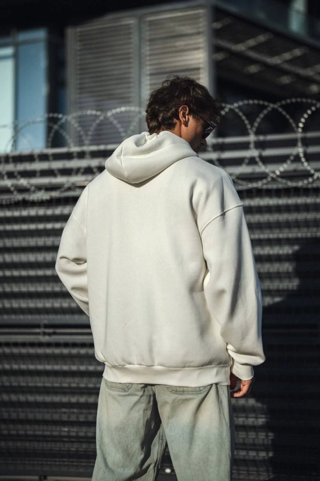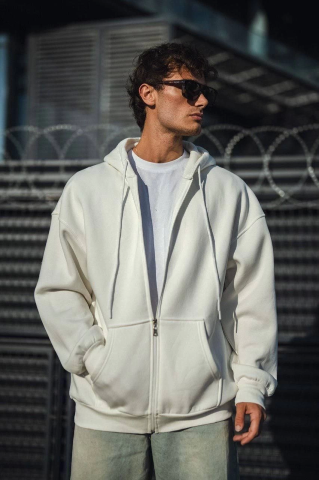 Oversize Tam Fermuarlı Uzun Kol Hırka – Beyaz