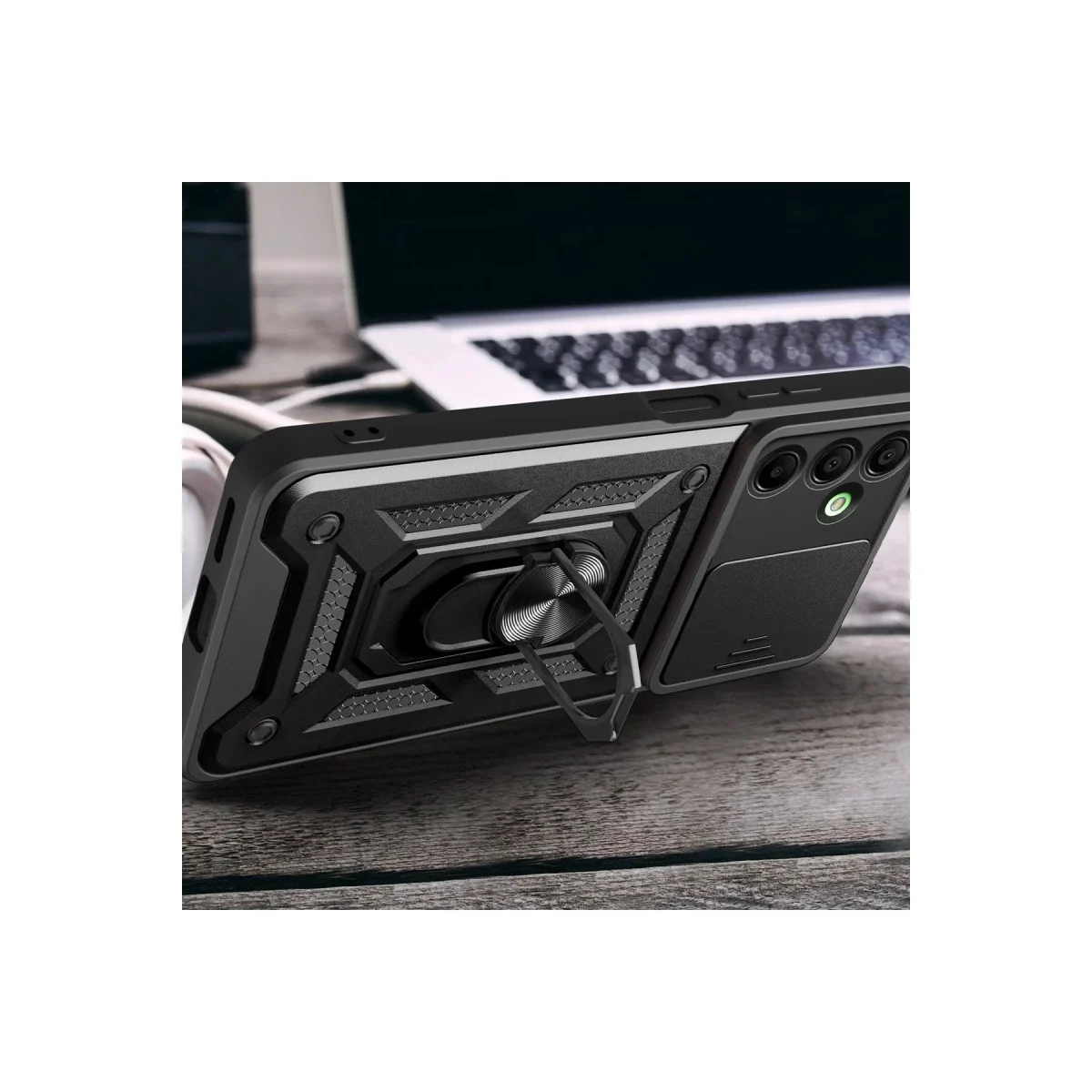 Kılıfın arka kısmında yer alan entegre metal halka hem tutucu hem de stand olarak işlev görür. Eller serbest video izleme, içerik görüntüleme ya da masaüstü kullanımı için idealdir.