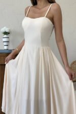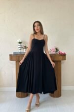 Kadın Askılı Geometrik Yakalı Geniş Kesim Detaylı Ithal Krep Elbise