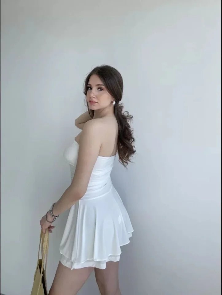 Straplez Mini Etek Görünümlü Şortlu Elbise Büzgülü Şık Yazlık – Beyaz