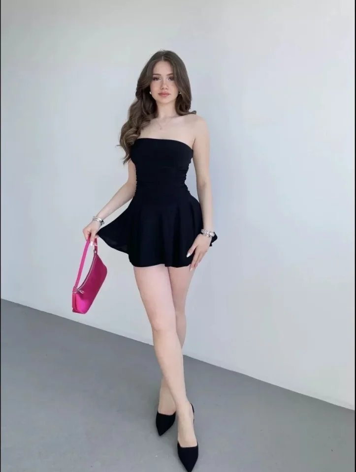 Straplez Mini Etek Görünümlü Şortlu Elbise Büzgülü Şık Yazlık – Siyah