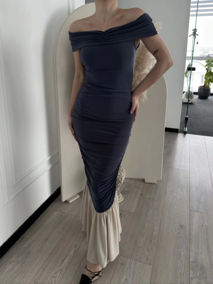 Striptiz Omuzlu Uzun Elbise- Füme