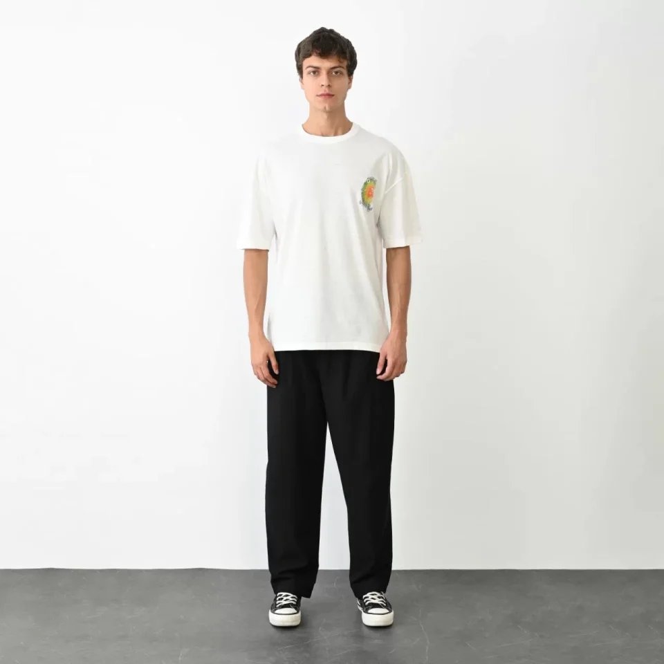 Unisex Bisiklet Yaka Baskılı Oversize T-Shirt – Beyaz