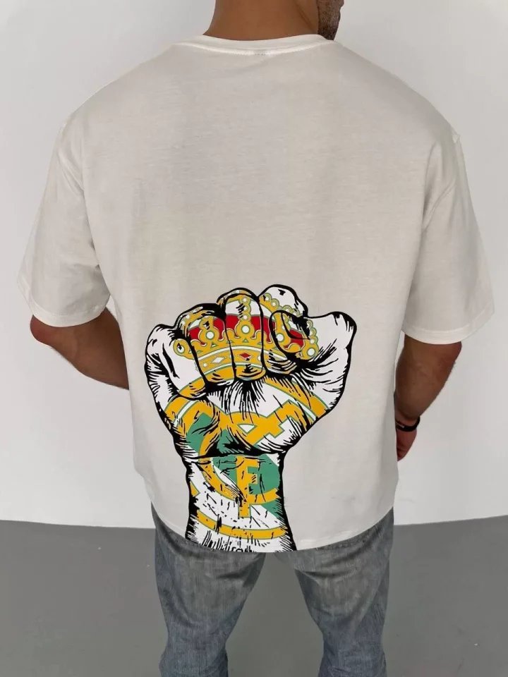 Unisex Bisiklet Yaka Baskılı Oversize T-Shirt – Beyaz