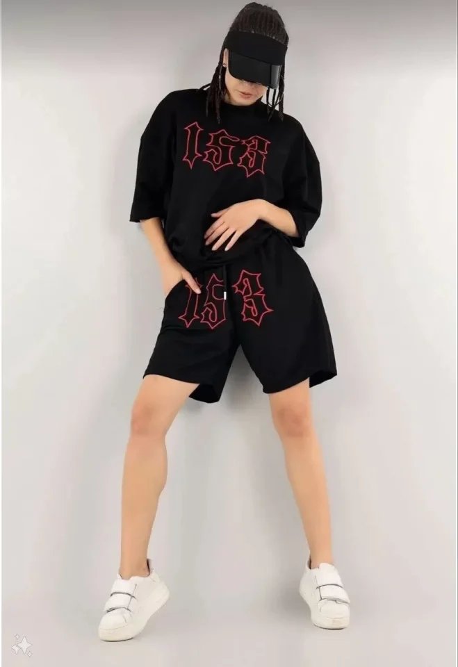 Unisex Nakış İşlemeli Şort Takım – Siyah