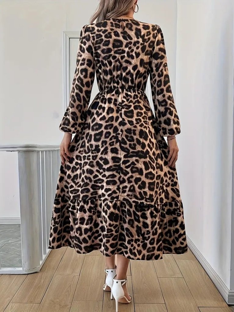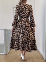 Uzun Kollu Bisiklet Yaka Leopar Desenli Midi Süprem Elbise
