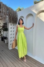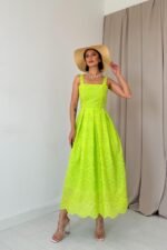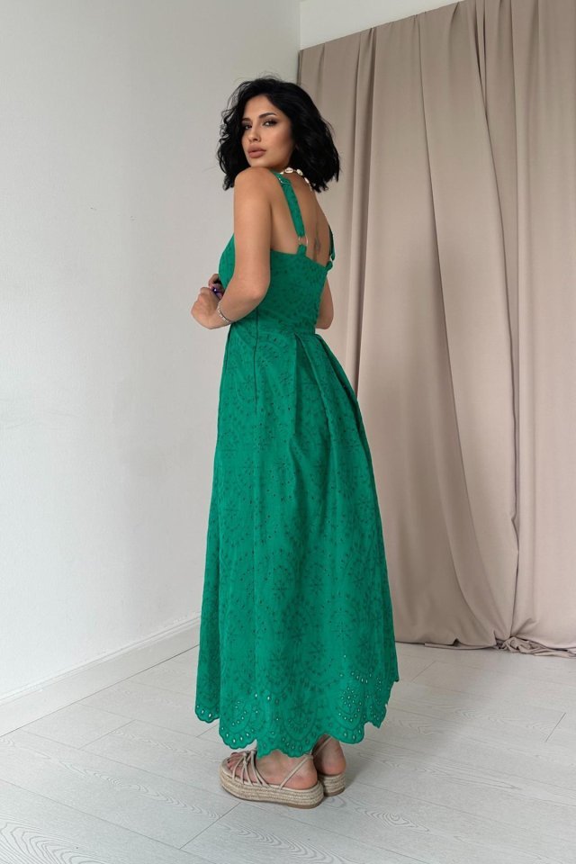 Yağ Yeşili Askılı Aparatlı Brode Elbise