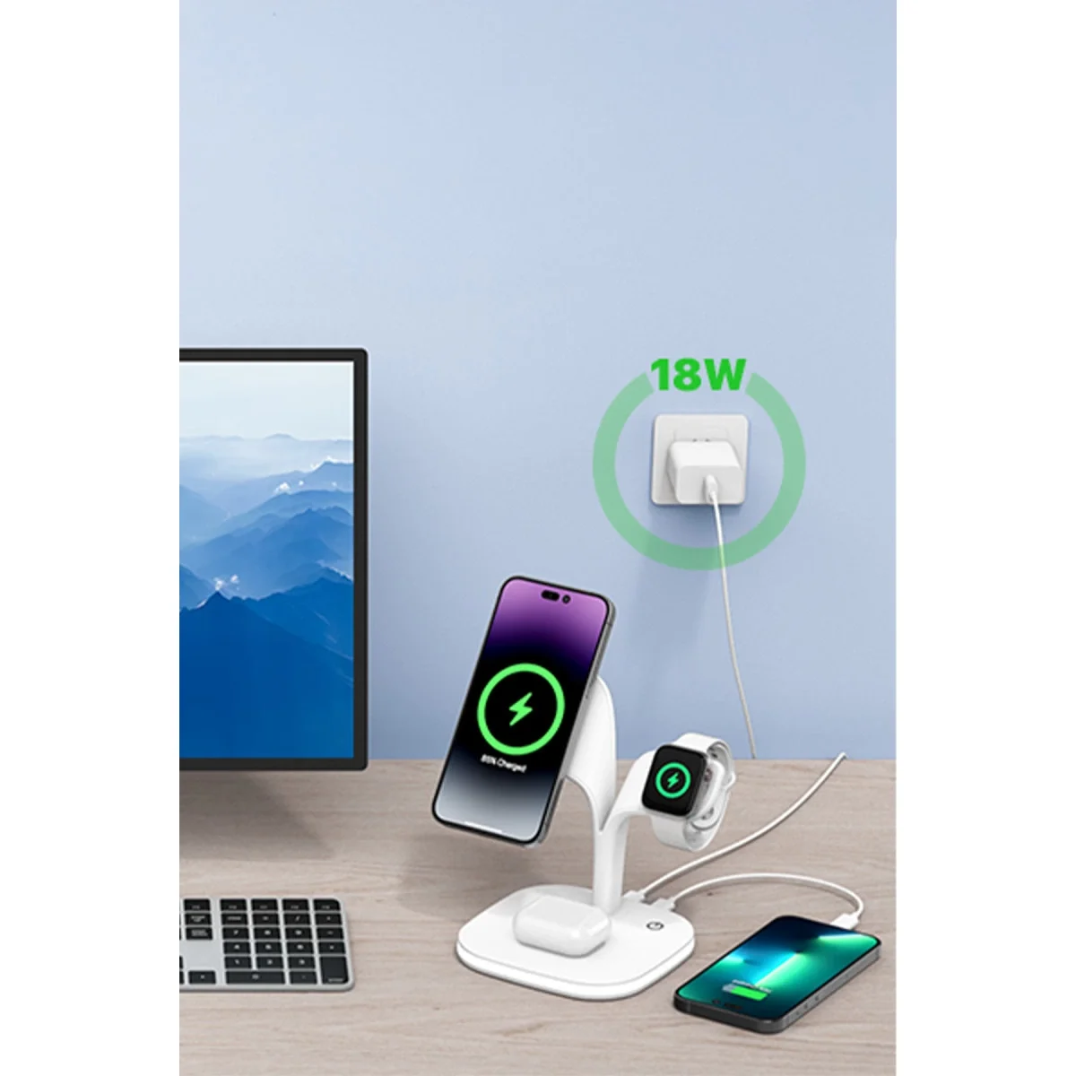 Phone, AirPods, iWatch ve ek Qi uyumlu cihazları aynı anda şarj ederek verimliliğinizi artırır.