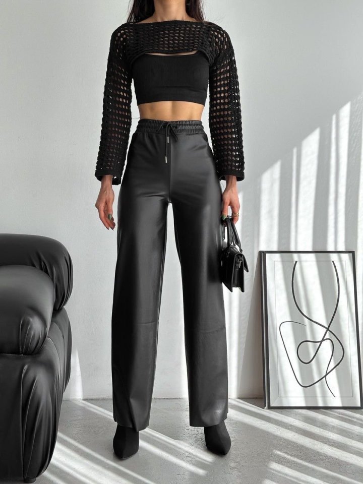 Yüksek Bel Geniş Paça Içi şardonlu Deri Pantolon.